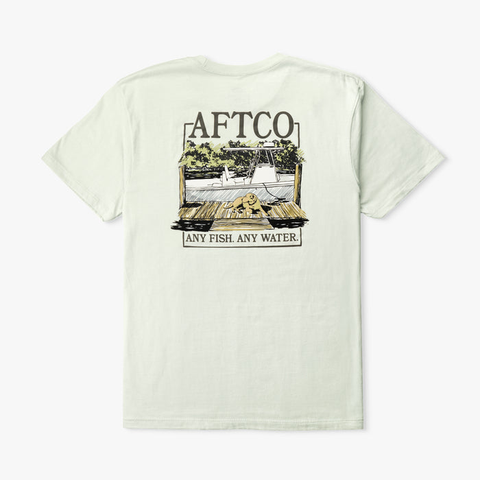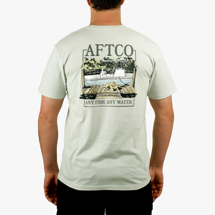 Seek displays the ultimate saltwater setup with a center console at the ready and a labrador retriever sitting dockside. This boat t-shirt is made from a comfortable 60/40 cotton-poly blend fabric designed to last wear after wear. From chasing tuna to kicking back, AFTCO has you covered.