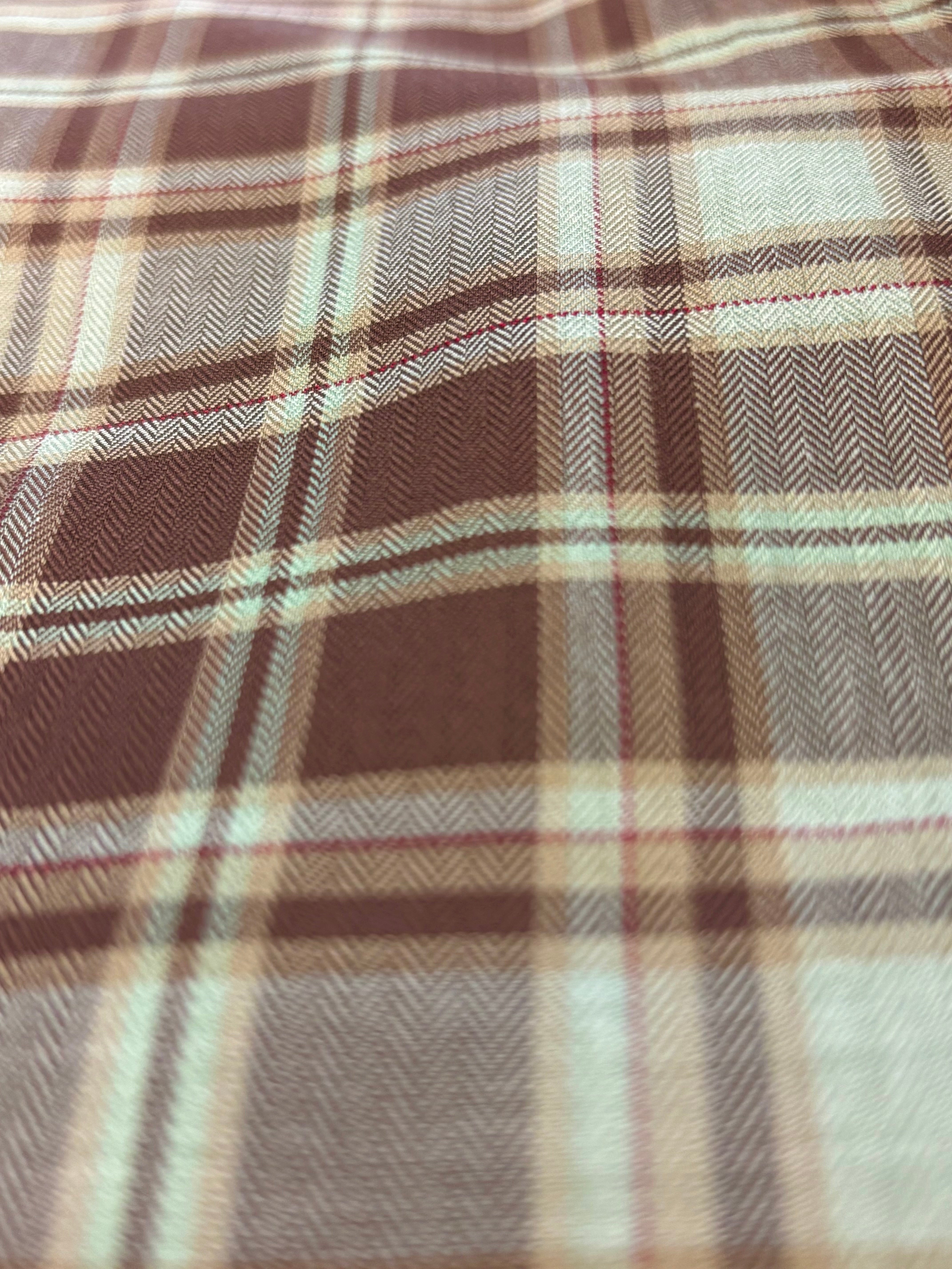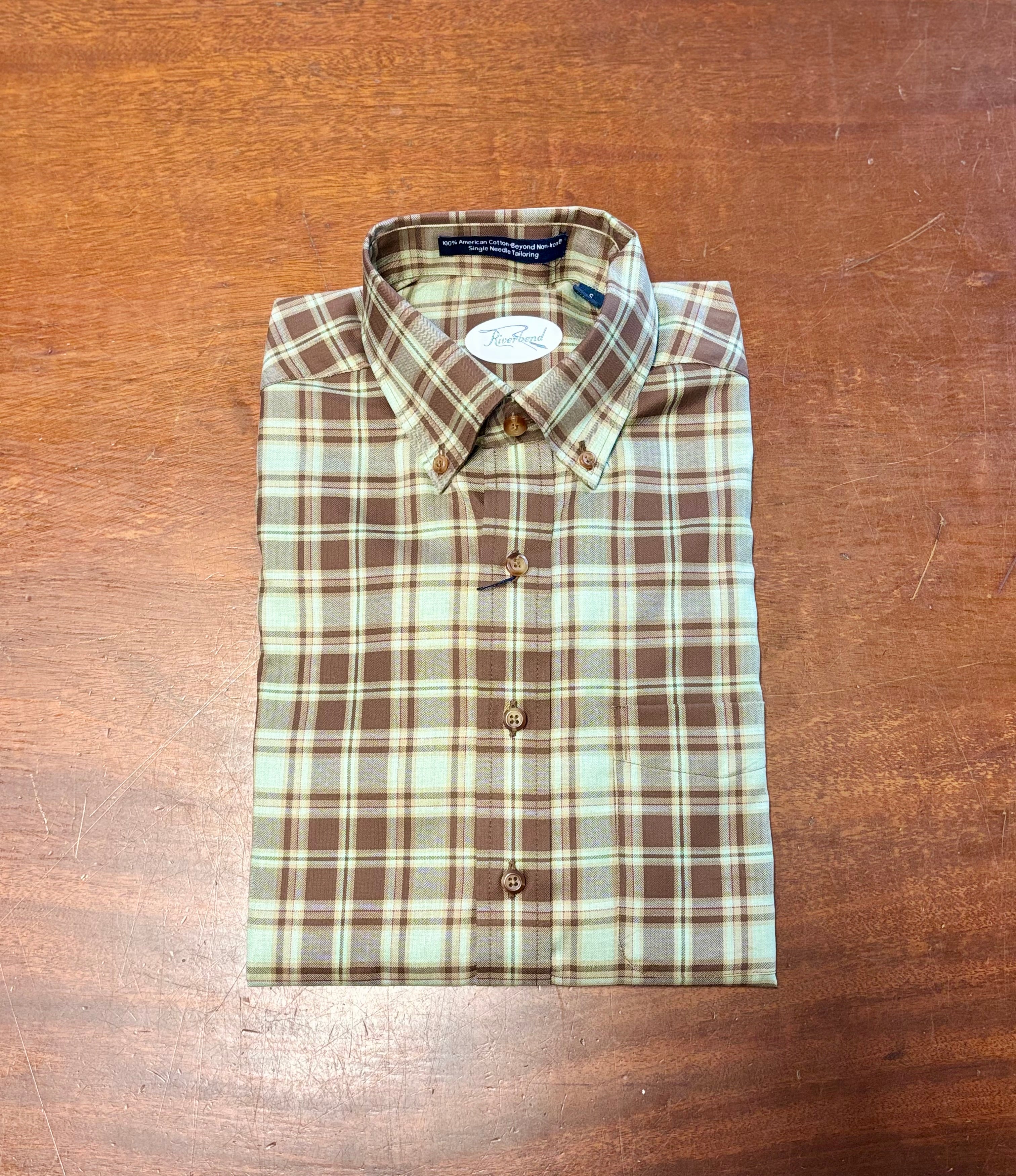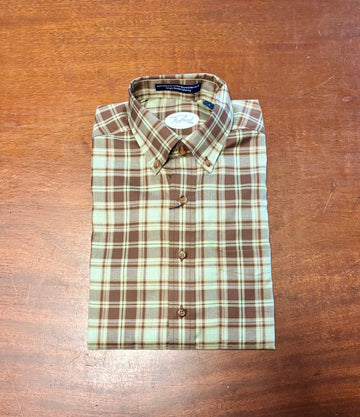 The Riverbend Men's Tailored Long Sleeve Dress Shirt in the Callum design combines refined craftsmanship with timeless style. Featuring a tailored fit that enhances your silhouette, this shirt is crafted in an elegant olive hue elevated by a subtle brown plaid pattern. Its button-down collar and long sleeves provide a polished and versatile look, suitable for both formal occasions and sophisticated everyday wear. The delicate interplay of colors and meticulous tailoring make this shirt a distinguished addition to any gentleman’s wardrobe, embodying understated elegance and versatility.