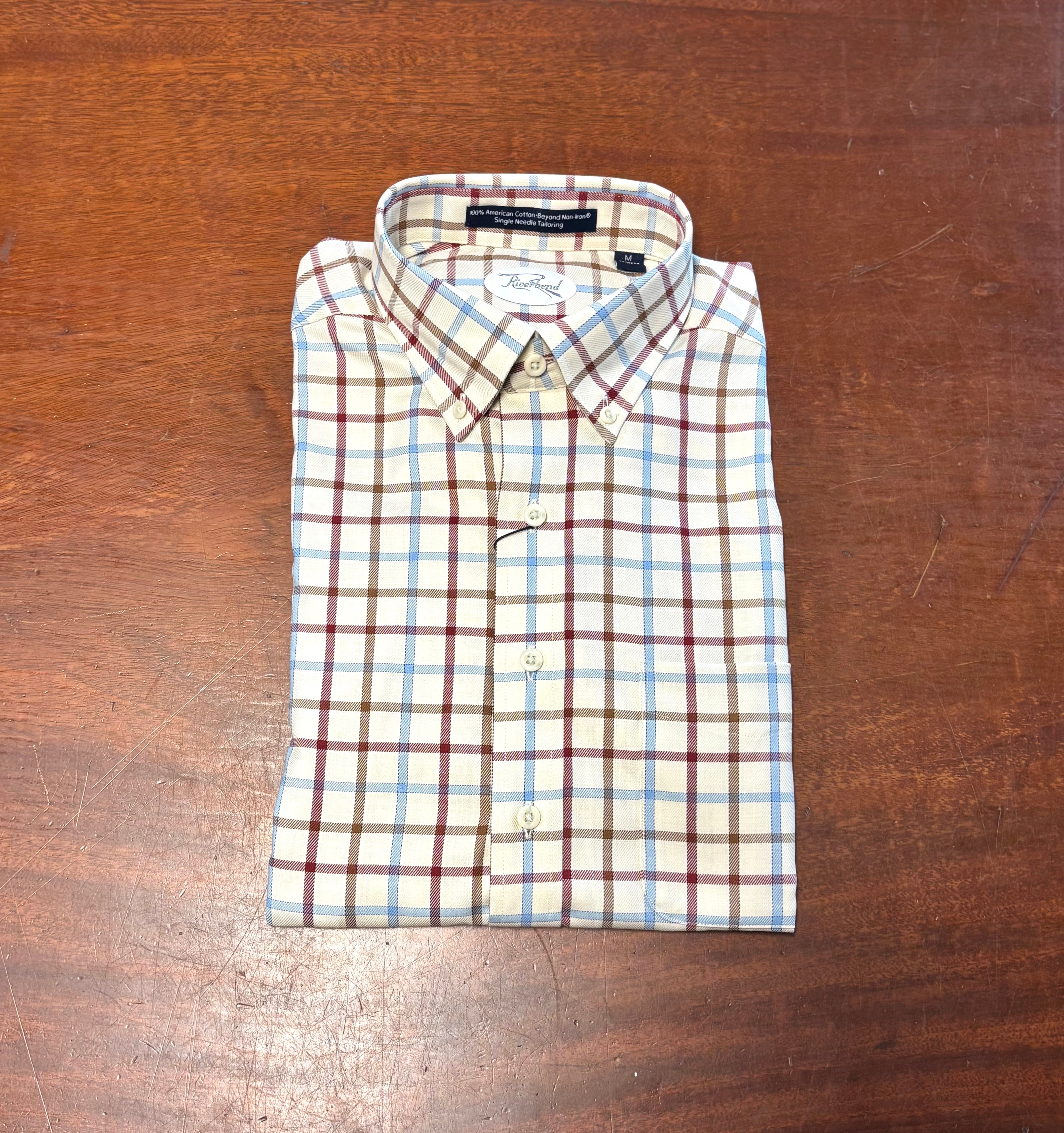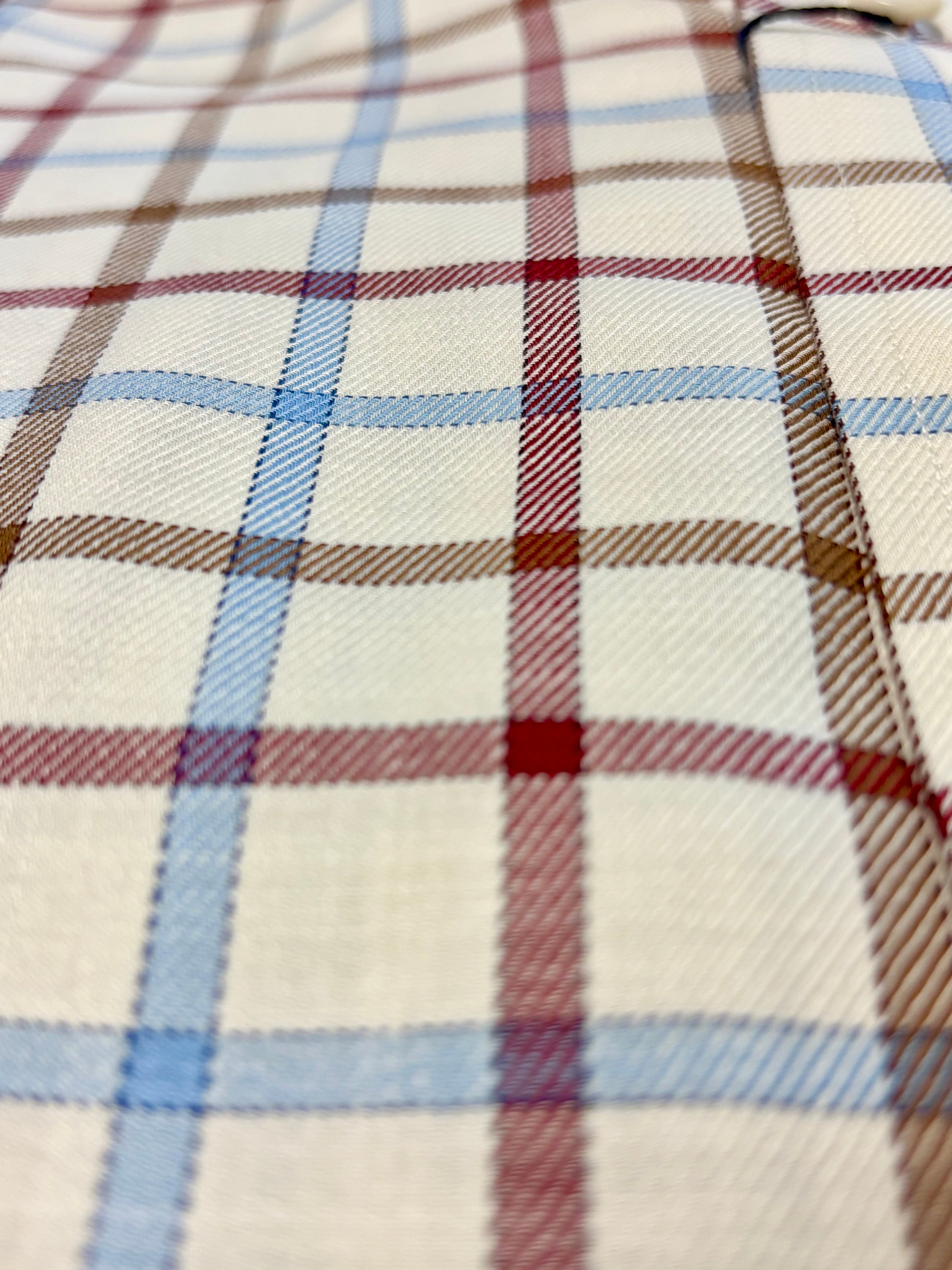 This long-sleeve button-down shirt offers a tailored fit that enhances your silhouette with understated elegance. Crafted in a sophisticated cream color, it is adorned with a tasteful plaid pattern in red, brown, and blue, adding depth and character to your ensemble. Ideal for both professional settings and refined casual occasions, this shirt delivers timeless style with a modern touch.