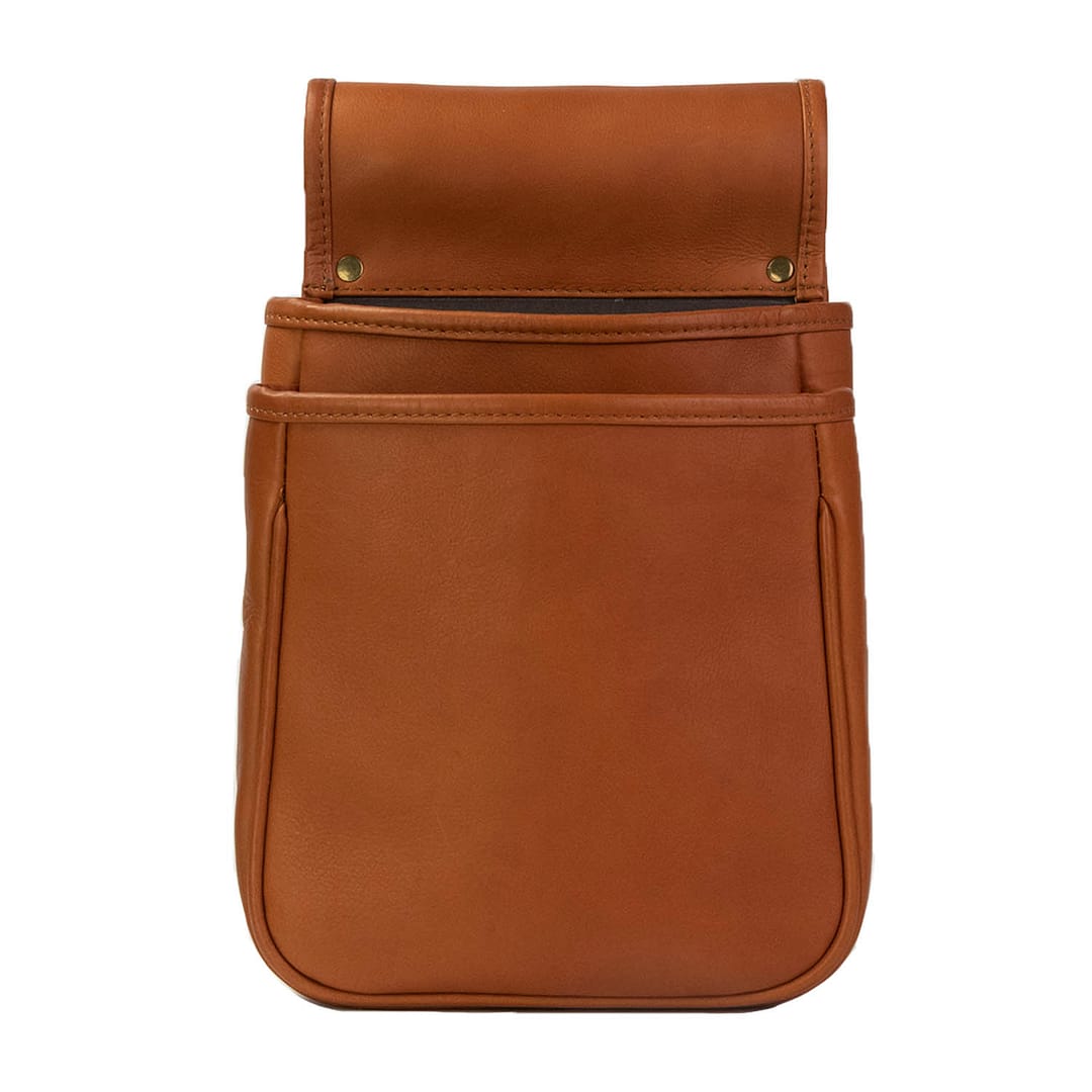 Crafted from Top Grain Columbian Leather, the Regal Deluxe Shotgun Shell Bag features two compartments with a Durable Mocha Brown Nylon Lining. The Regal features an open top which allows the shooter quick access to more ammunition. A slot in the back allows the pouch to be attached to a belt. The double compartment is handy to separate your empty shells from the live shells. This is great for a day of shooting at the range or to use while in the field.