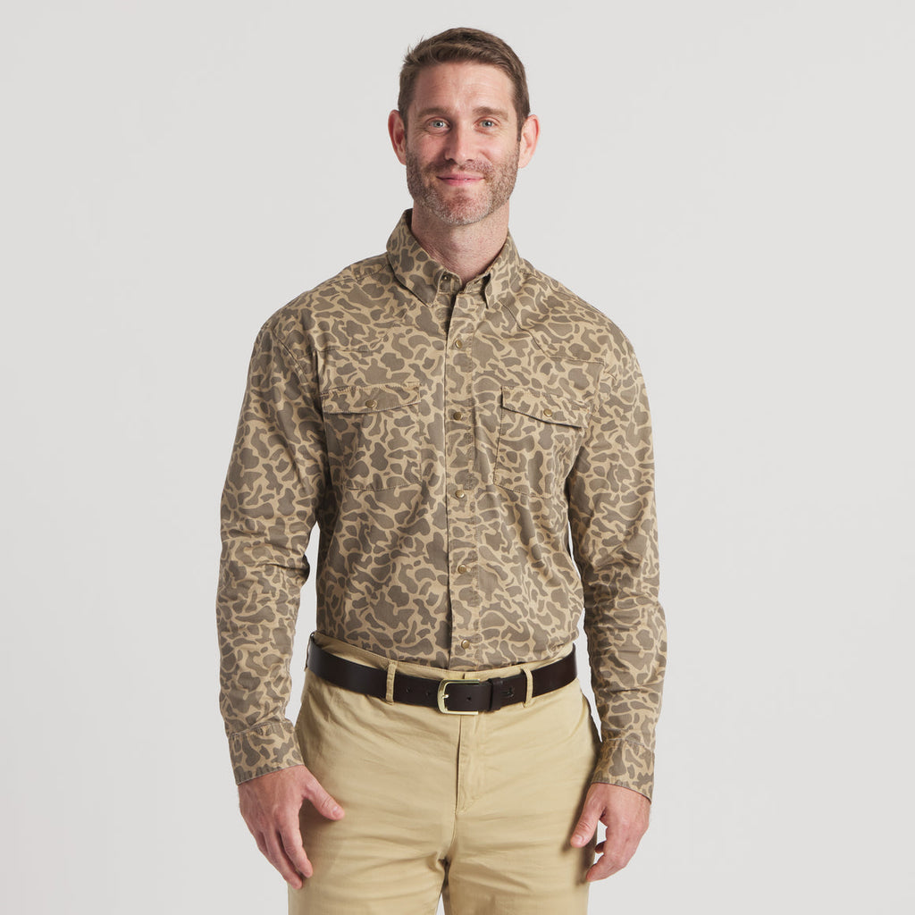 Inspired by the outdoors and featuring an all over camo print, our El Campo Performance Ranch Shirt is crafted from a sturdy, durable fabric and boasts 2 handy chest pockets. Designed for a comfortable fit throughout the day, this shirt is best paired with our Regatta Stretch Chino or Cahaba Comfort Stretch Twill Pants.